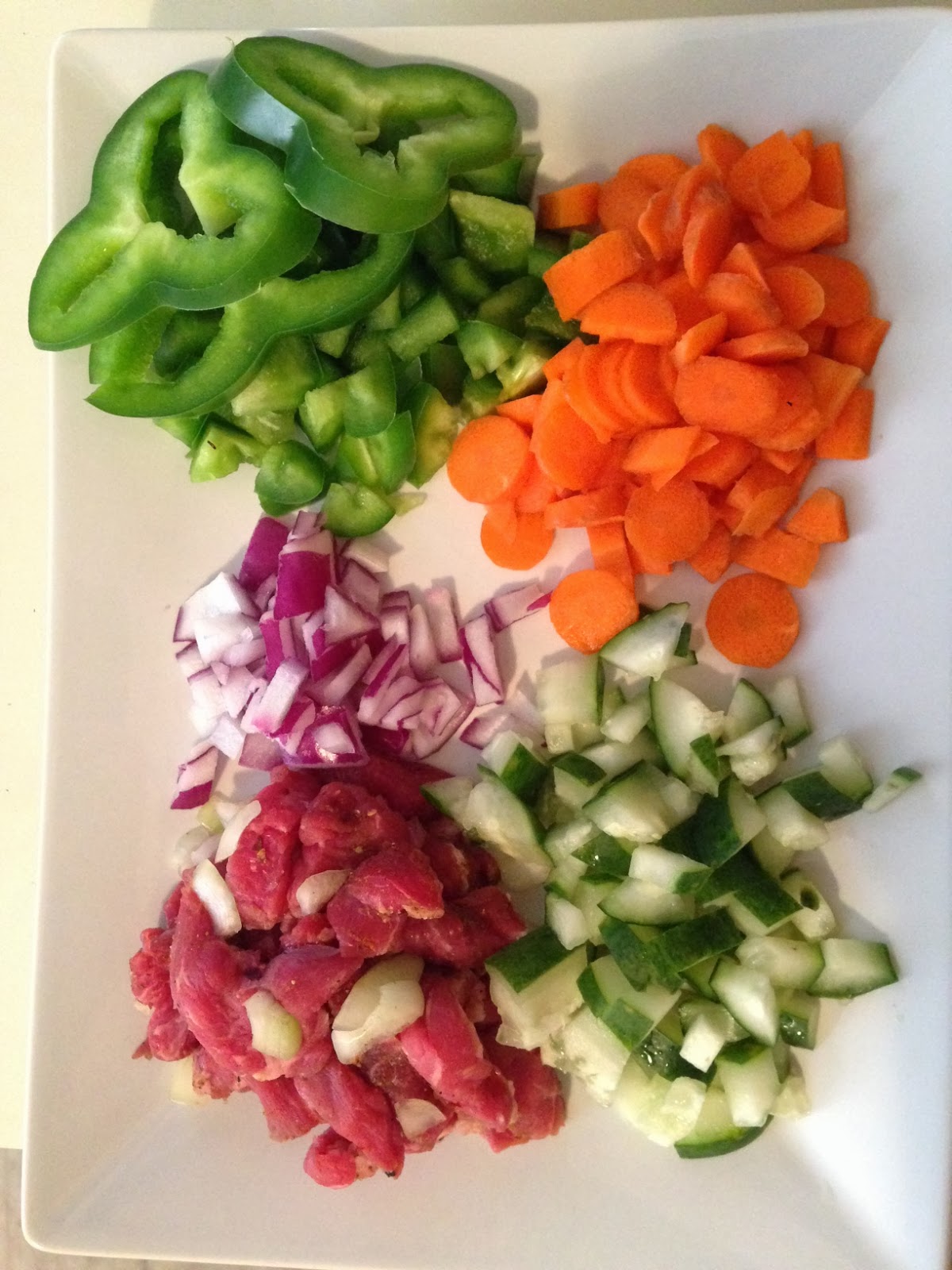 - Chop up the beef and vegetables. Spice your meat with red pepper, salt, black pepper and onion powder.